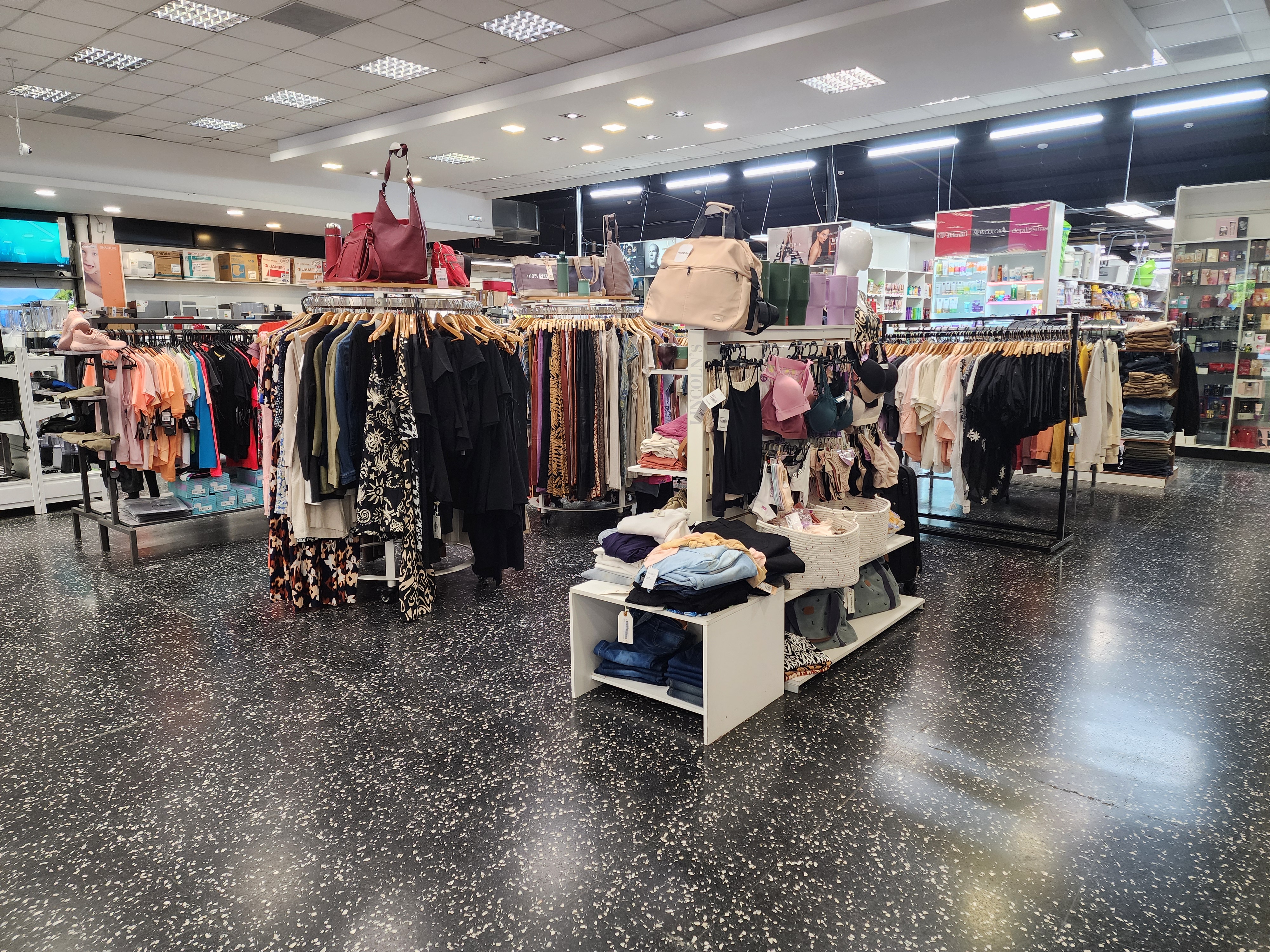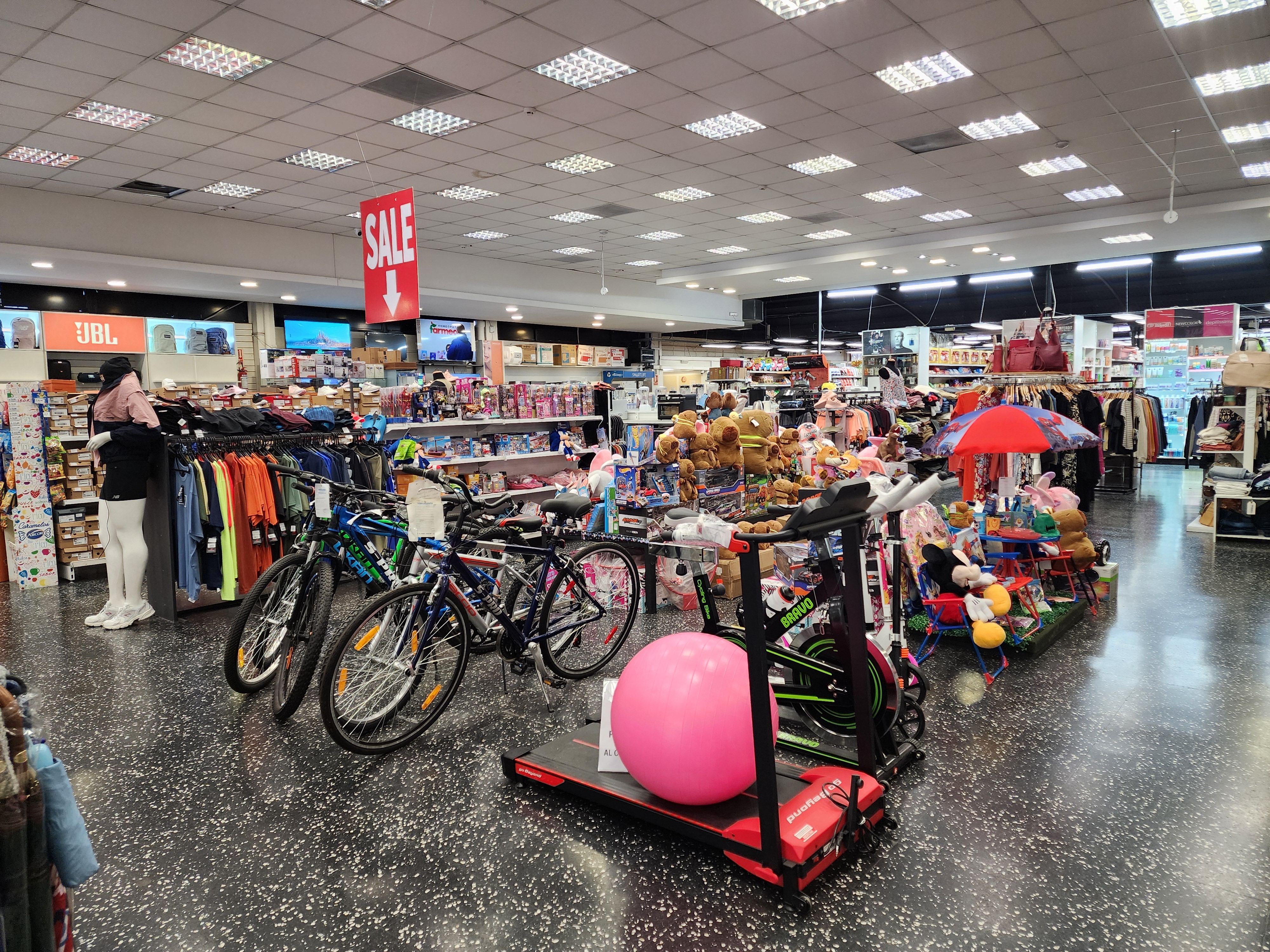 Contamos con una amplia variedad de artículos en distintas secciones: electrodomésticos, electrónica y bazar, indumentaria deportiva, calzado, prendas para damas y caballeros, niños, cosmética y perfumería, ropa de cama, ropa para baño, juguetería.