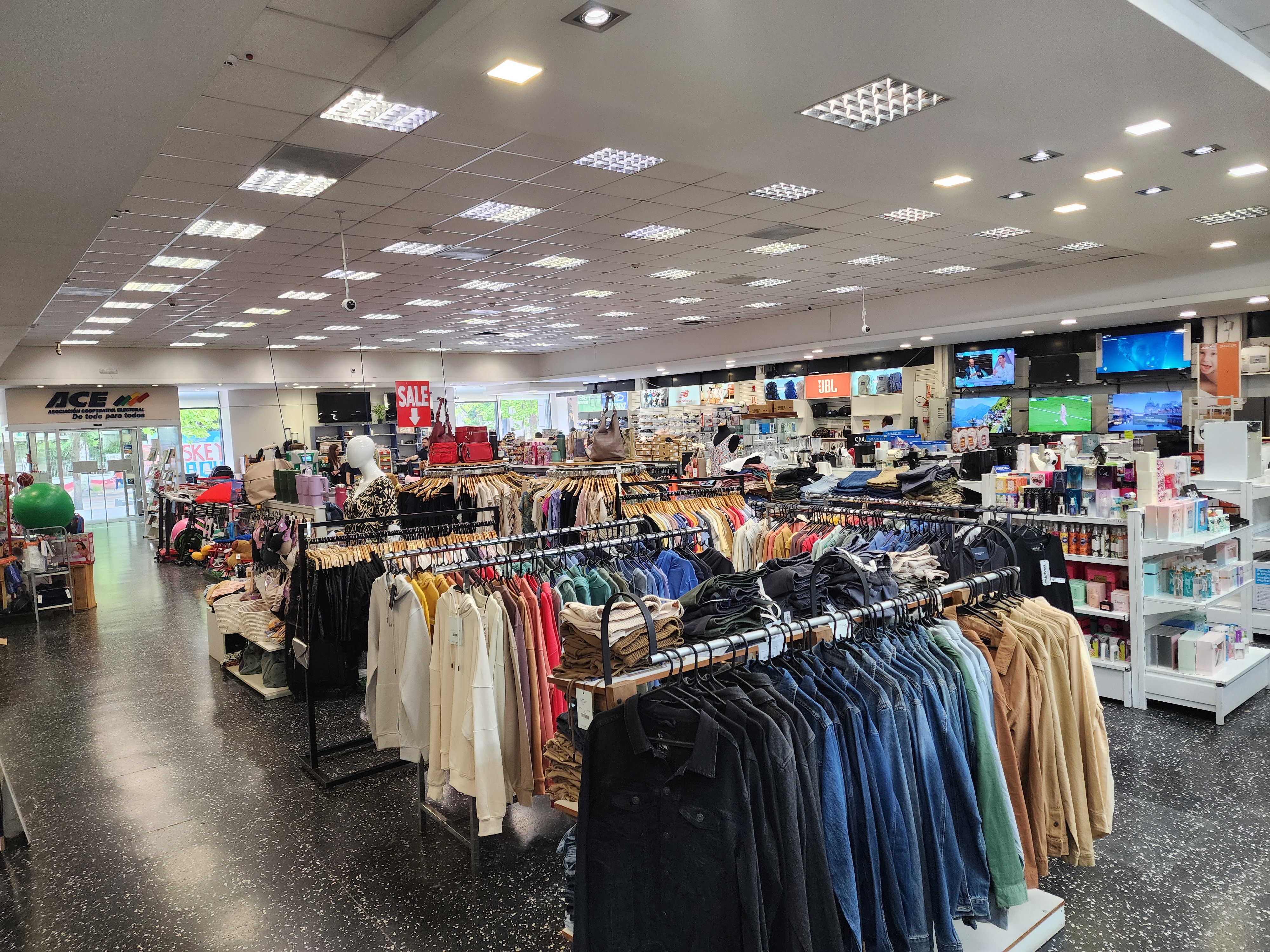 Contamos con una amplia variedad de artículos en distintas secciones: electrodomésticos, electrónica y bazar, indumentaria deportiva, calzado, prendas para damas y caballeros, niños, cosmética y perfumería, ropa de cama, ropa para baño, juguetería.